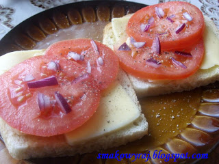 Kanapki upieczone w tosterze, z serem, pomidorkiem i czerwoną cebulą z prawdopodobnie najlepszych tostów na świecie, bo z samych naturalnych składników- wyprodukował je dla mnie mój teść, stąd ta pewność :)